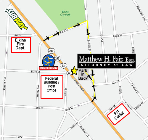 While our office is located on Randolph Avenue, parking is most convenient in the rear of the building and can be accessed via Buffalo Street as seen on the map above. If you have any questions or are unfamiliar with the downtown Elkins area, give us a call at 304.636.7222 and we'll be happy to provide you with detailed directions.